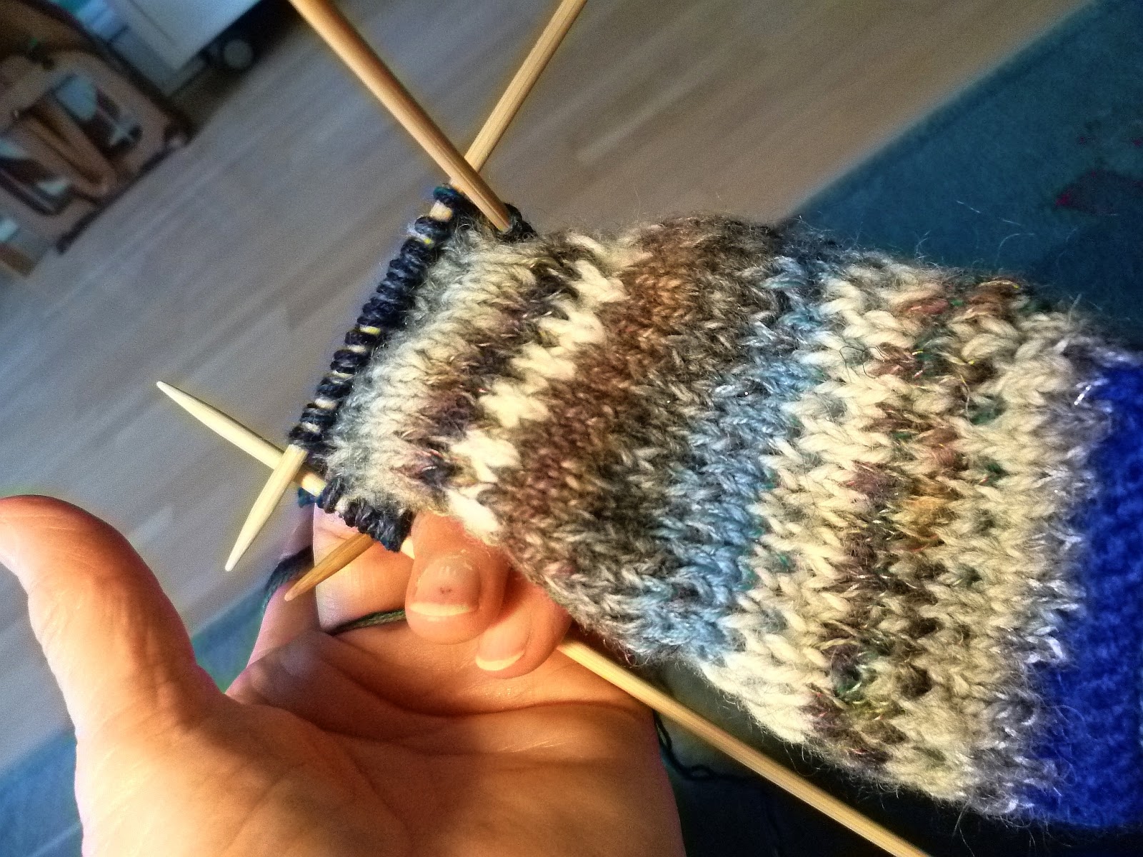 Das Schöne war hier, ich musste die Wollresten nicht in zwei Teile teilen, wie bei Mittli oder Socken. Habe nur etwas darauf geachtet, dass die Seiten sich ähnlich sind.